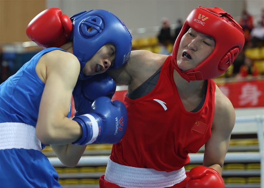 10月22日,河北九江队选手尹军花(右)与西藏队选手李梓君在57公斤级决赛中。 当日,在河北省迁安市唐山九江体育中心进行的2020年“迁安杯”全国女子拳击锦标赛57公斤级决赛中,河北九江队选手尹军花以5比0战胜西藏队选手李梓君,获得冠军。 新华社记者杨世尧摄