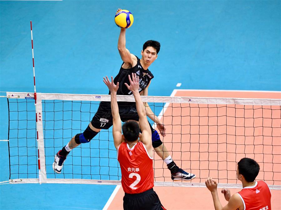 10月22日,福建队球员陈作栋(上)在比赛中进攻。 当日,在福建省漳州体育训练基地举行的2020年全国男排锦标赛A组小组赛中,江苏队以3比1战胜福建队。 新华社记者 姜克红 摄