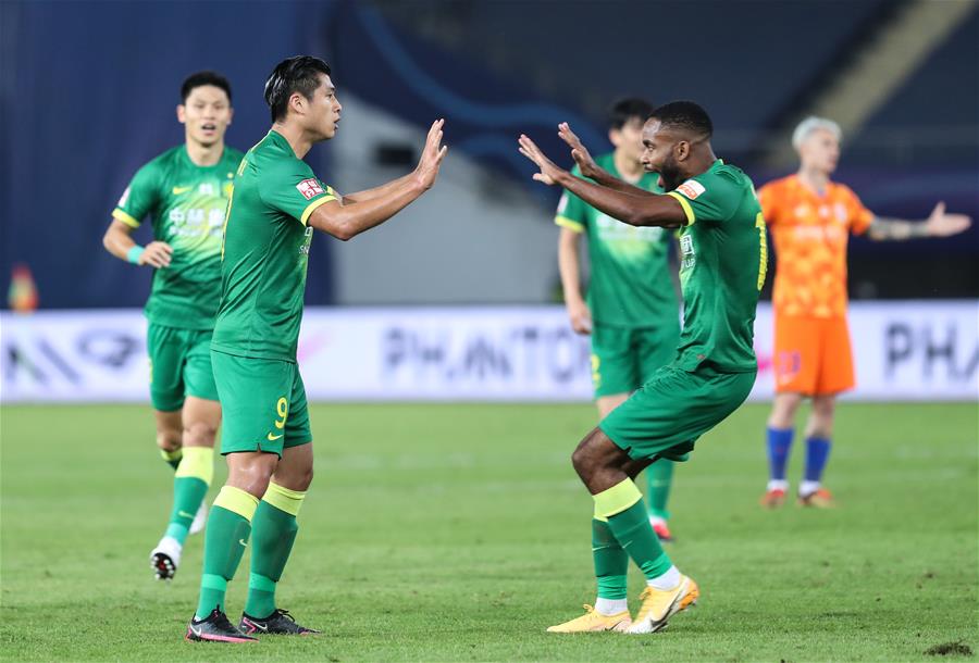 10月22日,北京中赫国安队球员张玉宁(前左)与队友巴坎布在比赛中庆祝进球。 当日,在2020赛季中国足球协会超级联赛(苏州赛区)第16轮比赛中,北京中赫国安队以2比1战胜山东鲁能泰山队。最终北京中赫国安队以两轮总比分4比3战胜山东鲁能泰山队,晋级四强。 新华社记者杨磊摄