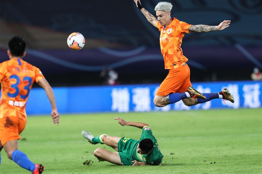 10月22日,北京中赫国安队球员王刚(下)在比赛中与山东鲁能泰山队球员格德斯(右)拼抢。 当日,在2020赛季中国足球协会超级联赛(苏州赛区)第16轮比赛中,北京中赫国安队以2比1战胜山东鲁能泰山队。最终北京中赫国安队以两轮总比分4比3战胜山东鲁能泰山队,晋级四强。 新华社记者杨磊摄
