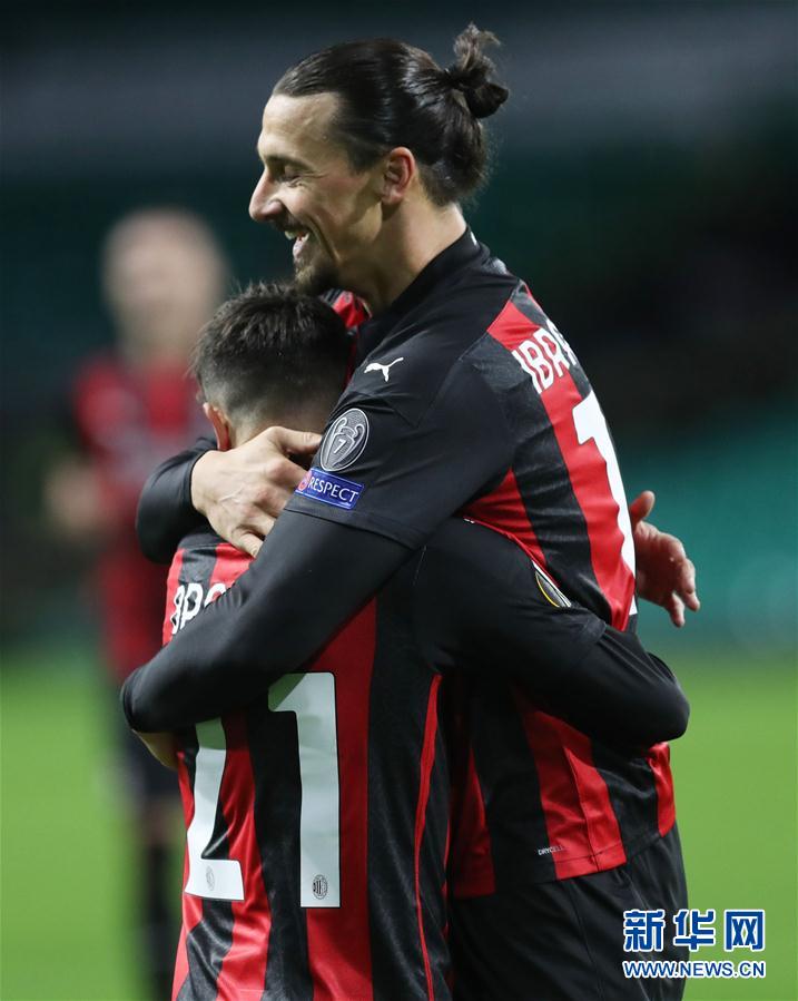 10月22日,AC米兰队球员迪亚斯(左)在进球后和队友伊布拉希莫维奇庆祝。 当日,在2020-2021赛季欧罗巴联赛小组赛H组首轮比赛中,意甲AC米兰队客场以3比1战胜苏超凯尔特人队。 新华社/路透