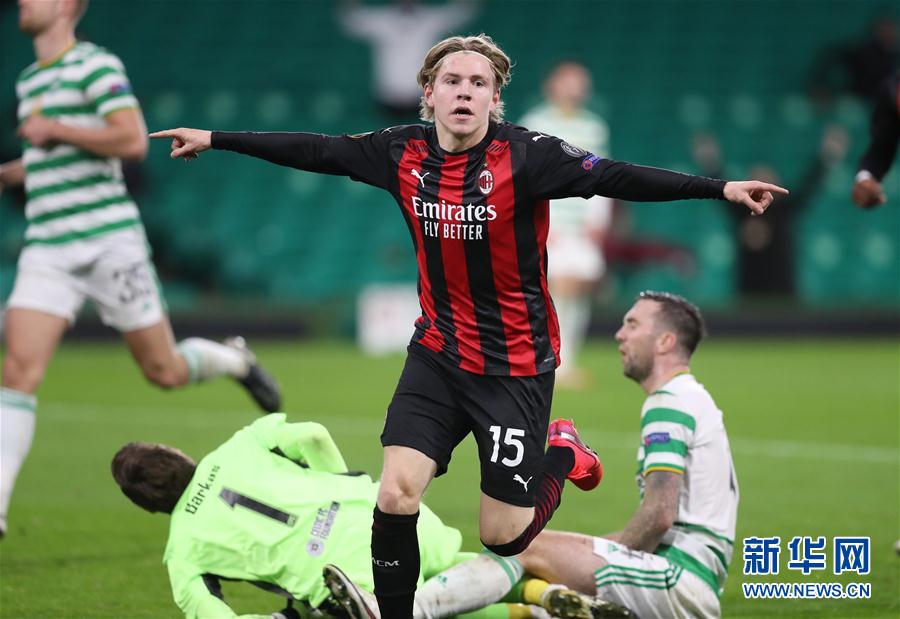 10月22日,AC米兰队球员海于格在进球后庆祝。 当日,在2020-2021赛季欧罗巴联赛小组赛H组首轮比赛中,意甲AC米兰队客场以3比1战胜苏超凯尔特人队。 新华社/路透