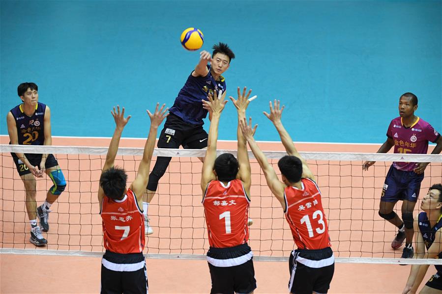 10月23日,上海队球员付候文(上)在比赛中进攻。 当日,在福建省漳州体育训练基地举行的2020年全国男排锦标赛B组小组赛中,湖北队以3比2战胜上海队。 新华社记者 姜克红 摄