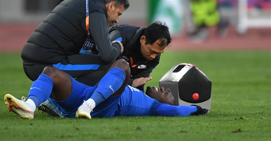 10月23日,河南建业队球员巴索戈(下)受伤倒地。 当日,在2020赛季中国足球协会超级联赛(大连赛区)第16轮比赛中,河南建业队以1比1战平武汉卓尔队。最终河南建业队以两轮总比分2比1战胜武汉卓尔队,保级成功。 新华社记者 姚剑锋 摄
