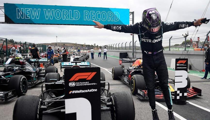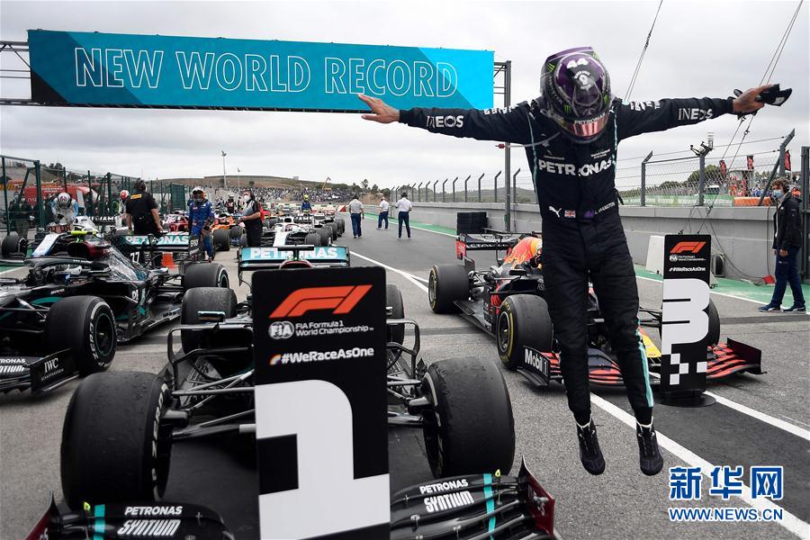 10月25日,汉密尔顿破纪录后跳起庆祝。 当日,在葡萄牙波尔蒂芒的阿尔加维赛道举行的2020赛季世界一级方程式锦标赛(F1)葡萄牙大奖赛正赛中,梅赛德斯车队英国车手汉密尔顿夺得冠军,从而以职业生涯92胜的战绩超越德国车手舒马赫,成为F1历史上获胜场次最多的车手。 新华社/法新