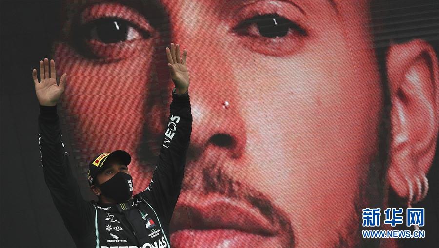 10月25日,汉密尔顿在颁奖仪式上庆祝。 当日,在葡萄牙波尔蒂芒的阿尔加维赛道举行的2020赛季世界一级方程式锦标赛(F1)葡萄牙大奖赛正赛中,梅赛德斯车队英国车手汉密尔顿夺得冠军,从而以职业生涯92胜的战绩超越德国车手舒马赫,成为F1历史上获胜场次最多的车手。 新华社/法新
