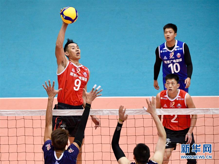 10月26日,江苏队球员刘向东(左上)在比赛中进攻。 当日,在福建省漳州体育训练基地举行的2020年全国男排锦标赛第二阶段交叉赛中,江苏队以3比1战胜河北队。 新华社记者 姜克红 摄