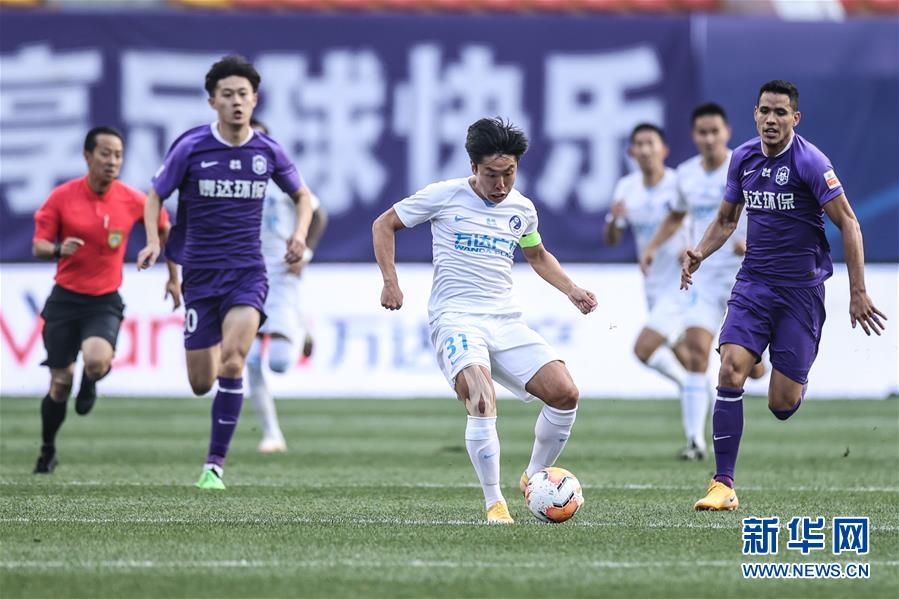 10月26日,大连人队球员郑龙(中)在比赛中传球。 当日,在2020赛季中国足球协会超级联赛(大连赛区)第17轮比赛中,天津泰达队以2比0战胜大连人队。 新华社记者潘昱龙摄