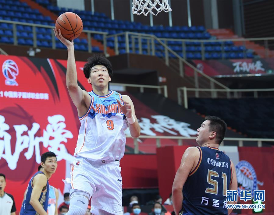 10月26日,新疆伊力特队球员周琦(前左)在比赛中上篮。 当日,在浙江诸暨举行的2020-2021赛季中国男子篮球职业联赛(CBA)第一阶段第四轮比赛中,新疆伊力特队对阵南京同曦宙光队。 新华社记者 翁忻旸 摄
