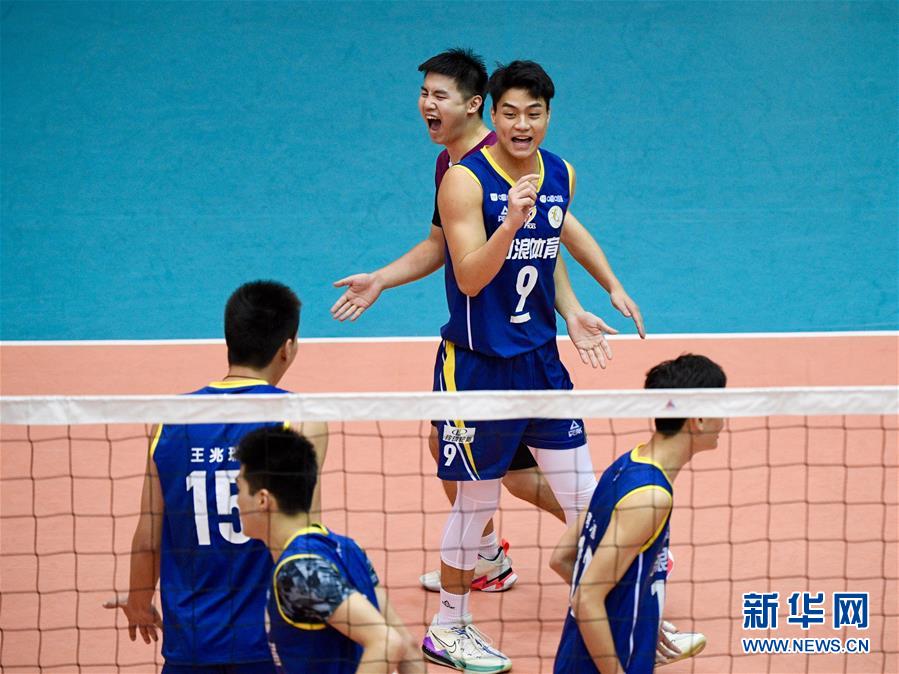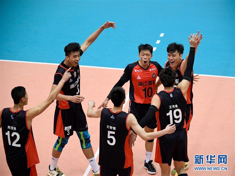 10月26日,浙江队球员庆祝。 当日,在福建省漳州体育训练基地举行的2020年全国男排锦标赛第二阶段交叉赛中,浙江队以3比1战胜四川队。 新华社记者 姜克红 摄
