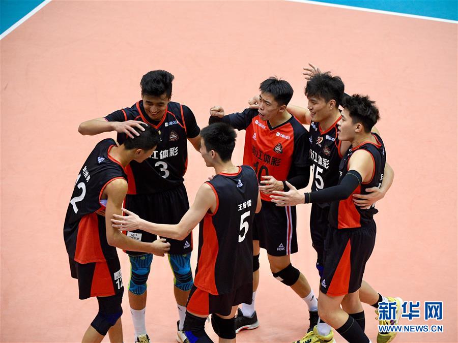 10月26日,四川队球员郭顺祥(上右)与队友庆祝得分。 当日,在福建省漳州体育训练基地举行的2020年全国男排锦标赛第二阶段交叉赛中,浙江队以3比1战胜四川队。 新华社记者 姜克红 摄