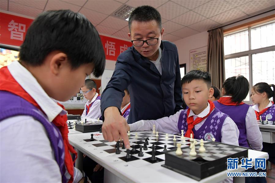 10月26日,在江西南昌育新学校教育集团青桥校区,老师在国际象棋课堂上指导学生下棋。 作为“全国国际象棋传统学校”,南昌育新学校教育集团青桥校区充分发扬校园独特的棋文化特色,把棋课安排进课表,每班每周开设一堂国际象棋课,让学生感受到棋文化之美。近年来,通过参加省、市一级比赛,学校培养了一大批国际象棋小棋手。 新华社记者 彭昭之 摄