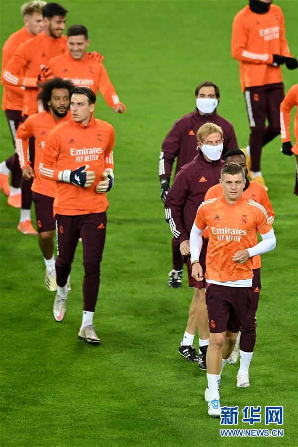 10月26日,皇家马德里队球员克罗斯(前)等参加训练。 当日,西甲皇家马德里队在德国门兴格拉德巴赫进行训练,备战10月27日与德甲门兴格拉德巴赫队的欧冠联赛B组的比赛。 新华社发(乌尔里希·胡夫纳格尔摄)