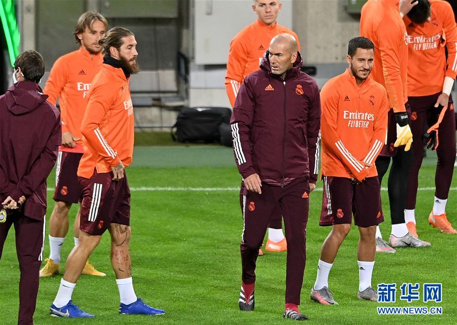 10月26日,皇家马德里队主教练齐达内(中)率队训练。 当日,西甲皇家马德里队在德国门兴格拉德巴赫进行训练,备战10月27日与德甲门兴格拉德巴赫队的欧冠联赛B组的比赛。 新华社发(乌尔里希·胡夫纳格尔摄)