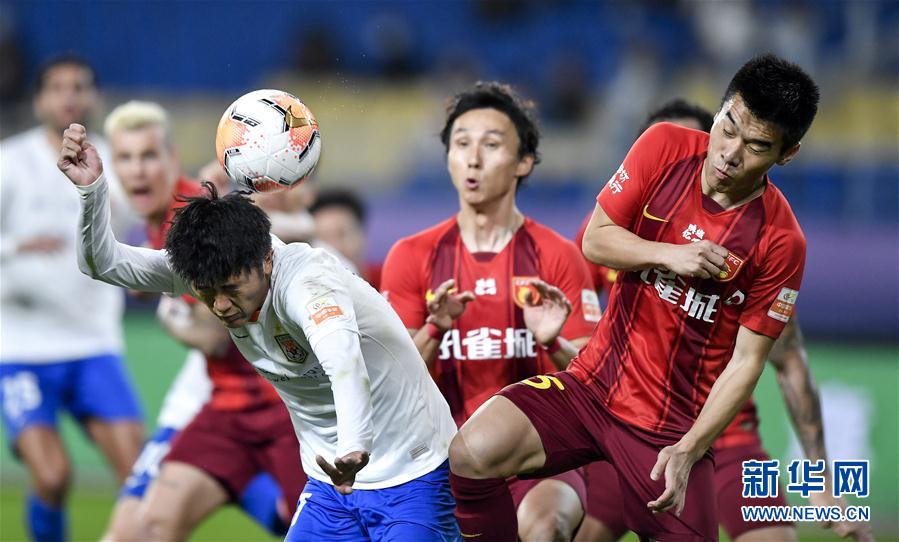 10月26日,山东鲁能泰山队球员刘洋(左)与河北华夏幸福队球员王秋明争顶头球。 当日,在2020赛季中国足球协会超级联赛(苏州赛区)第17轮比赛中,山东鲁能泰山队以2比2战平河北华夏幸福队。 新华社记者 许畅 摄