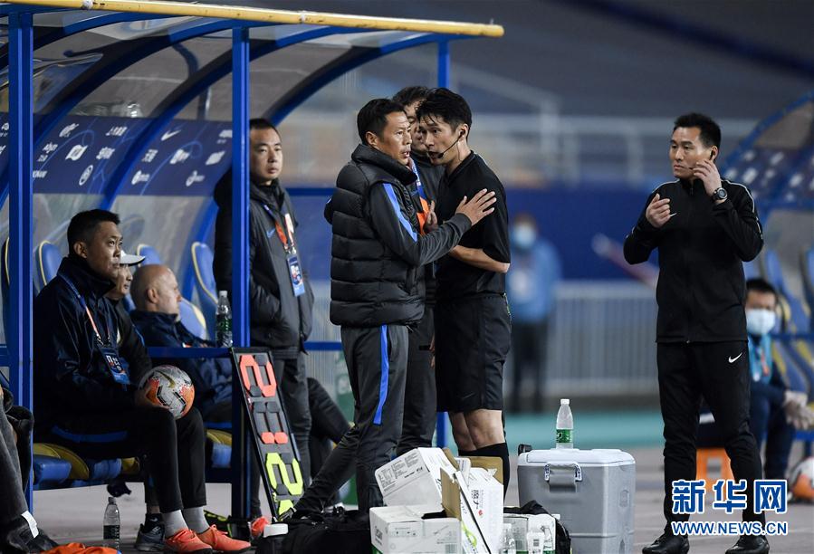 10月26日,主裁判艾堃(右二)示意山东鲁能泰山队教练组工作人员注意控制情绪。 当日,在2020赛季中国足球协会超级联赛(苏州赛区)第17轮比赛中,山东鲁能泰山队以2比2战平河北华夏幸福队。 新华社记者 许畅 摄