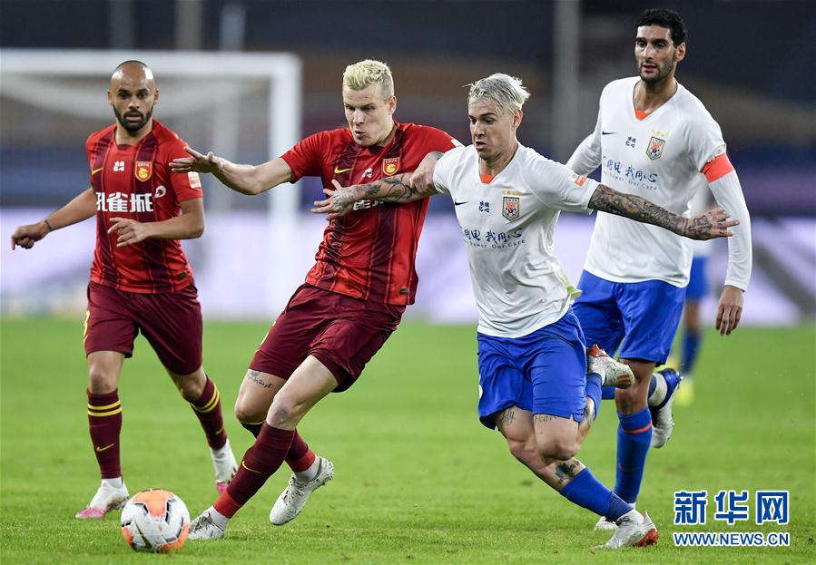 10月26日,山东鲁能泰山队球员格德斯(右二)在比赛中与河北华夏幸福队球员梅米舍维奇(左二)拼抢。 当日,在2020赛季中国足球协会超级联赛(苏州赛区)第17轮比赛中,山东鲁能泰山队以2比2战平河北华夏幸福队。 新华社记者 许畅 摄