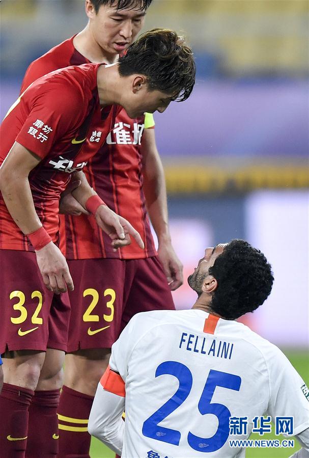 10月26日,山东鲁能泰山队球员费莱尼(右)与河北华夏幸福队球员丁海峰(左前)发生争执。 当日,在2020赛季中国足球协会超级联赛(苏州赛区)第17轮比赛中,山东鲁能泰山队以2比2战平河北华夏幸福队。 新华社记者 许畅 摄