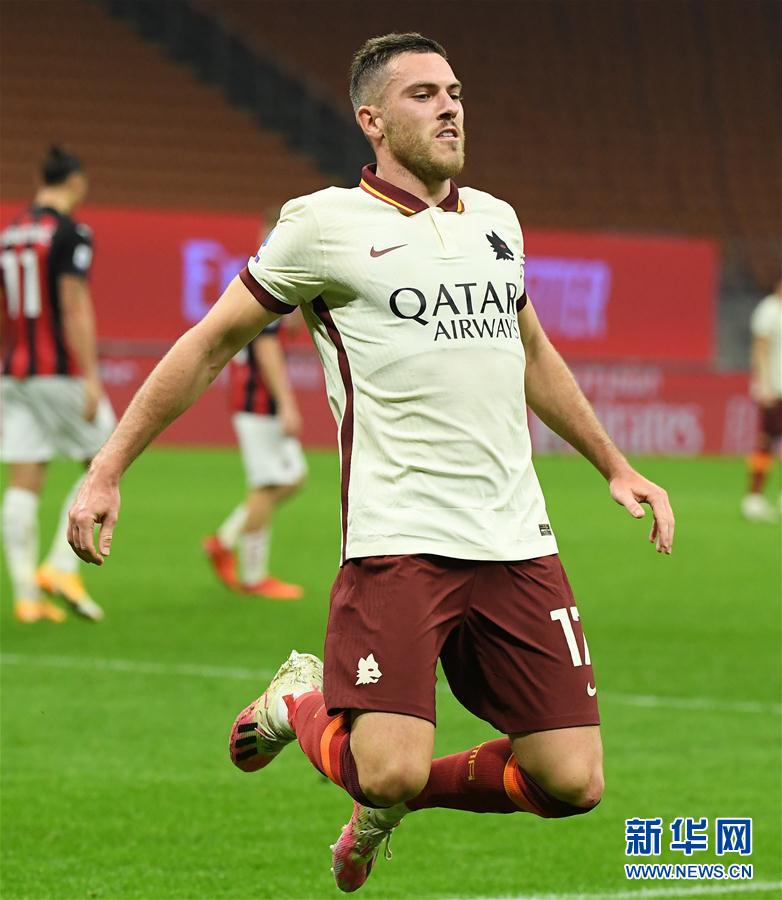 10月26日,罗马队球员韦勒图在进球后庆祝。 当日,在2020-2021赛季意大利足球甲级联赛第五轮比赛中,AC米兰队主场以3比3战平罗马队。 新华社发(阿尔贝托·林格里亚摄)
