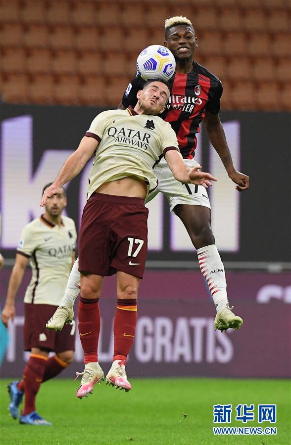 10月26日,AC米兰队球员莱奥(右)与罗马队球员韦勒图在比赛中争顶。 当日,在2020-2021赛季意大利足球甲级联赛第五轮比赛中,AC米兰队主场以3比3战平罗马队。 新华社发(阿尔贝托·林格里亚摄)