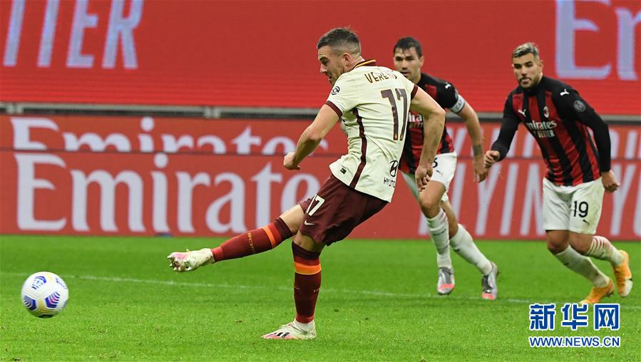 10月26日,罗马队球员韦勒图在比赛中主罚点球命中。 当日,在2020-2021赛季意大利足球甲级联赛第五轮比赛中,AC米兰队主场以3比3战平罗马队。 新华社发(阿尔贝托·林格里亚摄)