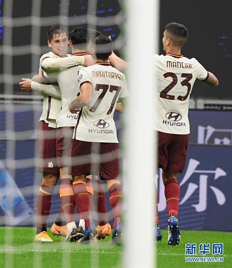 10月26日,罗马队球员库姆布拉(左一)进球后与队友庆祝。 当日,在2020-2021赛季意大利足球甲级联赛第五轮比赛中,AC米兰队主场以3比3战平罗马队。 新华社发(阿尔贝托·林格里亚摄)
