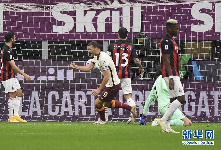 10月26日,罗马队球员哲科(左二)在进球后庆祝。 当日,在2020-2021赛季意大利足球甲级联赛第五轮比赛中,AC米兰队主场以3比3战平罗马队。 新华社发(阿尔贝托·林格里亚摄)