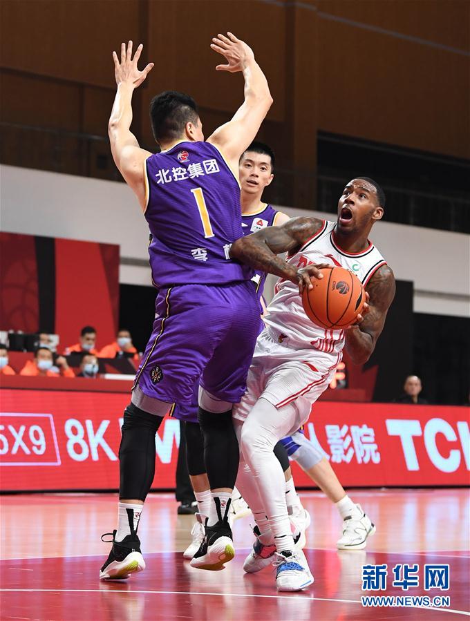10月26日,青岛国信海天队球员亚当斯(右)在比赛中进攻。 当日,在浙江诸暨举行的2020-2021赛季中国男子篮球职业联赛(CBA)第一阶段第四轮比赛中,青岛国信海天队以127比95战胜北京紫禁勇士队。 新华社记者 沙达提 摄