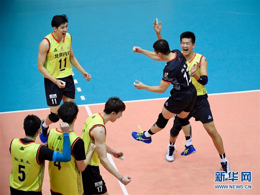 10月27日,北京队球员庆祝得分。 当日,在福建省漳州体育训练基地举行的2020年全国男排锦标赛第二阶段交叉赛中,北京队以3比1战胜山东队,闯进决赛。 新华社记者 姜克红 摄