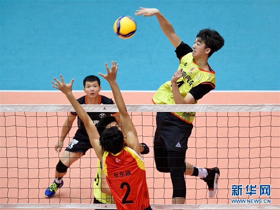 10月27日,北京队球员王东宸(右)在比赛中进攻。 当日,在福建省漳州体育训练基地举行的2020年全国男排锦标赛第二阶段交叉赛中,北京队以3比1战胜山东队,闯进决赛。 新华社记者 姜克红 摄