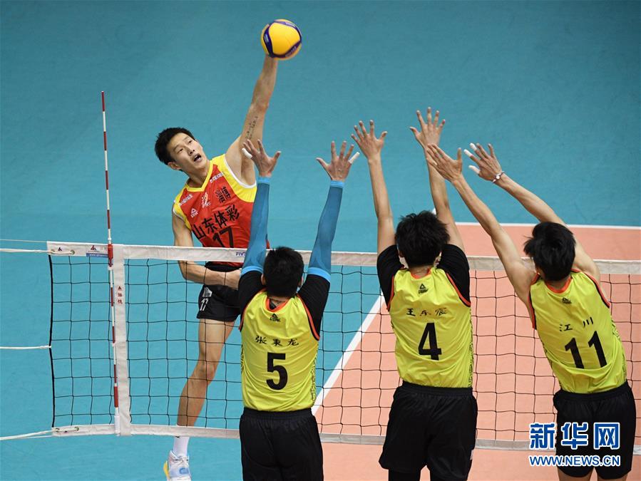 10月27日,山东队球员王径一(左一)在比赛中进攻。 当日,在福建省漳州体育训练基地举行的2020年全国男排锦标赛第二阶段交叉赛中,北京队以3比1战胜山东队,闯进决赛。 新华社记者 姜克红 摄