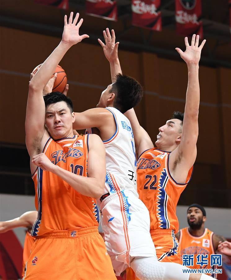 10月27日,福建豹发力队球员于长春(中)在比赛中突破上篮。 当日,在浙江诸暨举行的2020-2021中国男子篮球职业联赛(CBA)第一阶段第五轮比赛中,福建豹发力队对阵上海久事队。 新华社记者 沙达提 摄