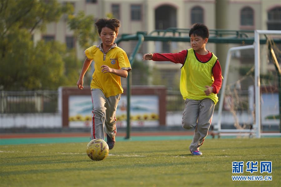 10月27日,小球员贺仡(左)与王孝阳在球场上比赛。 深秋时节,江西省靖安县第二小学的小球员们在日落前加紧练习。靖安县第二小学于2016年被选为全国青少年校园足球特色学校,校园足球氛围浓厚。 新华社记者 周密 摄