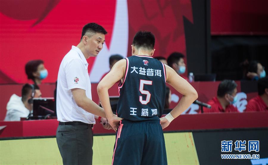 樽 10月27日,广东东莞大益队主教练杜锋(左)在比赛中指导球员王薪凯。 当日,在浙江诸暨举行的2020-2021赛季中国男子篮球职业联赛(CBA)第一阶段第五轮比赛中,广东东莞大益队以111比90战胜四川五粮金樽队。 新华社发(江汉摄)