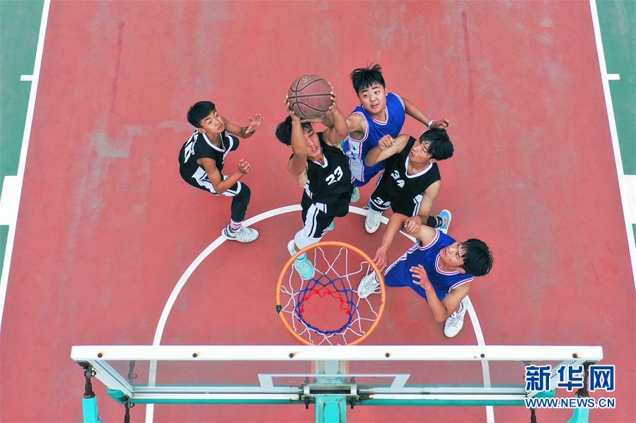 10月27日,在河南省平顶山市宝丰县第一高级中学,学生在参加篮球比赛(无人机照片)。 连日来,一场青少年运动会在河南省宝丰县举行,来自该县各中小学的学生在足球、篮球、乒乓球三个项目的比赛中奋力拼搏,展示风采,尽享运动带来的快乐。 新华社发(何五昌 摄)
