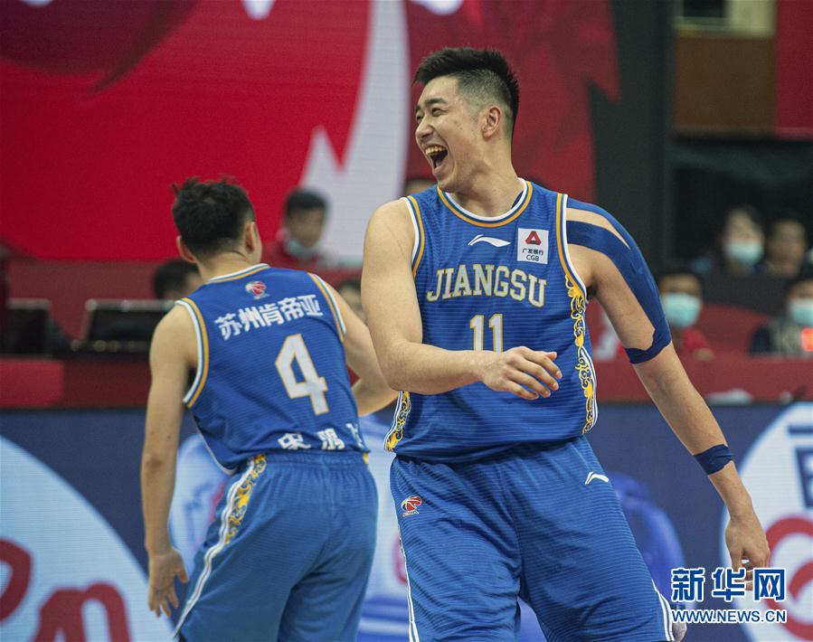 10月27日,苏州肯帝亚队球员吴冠希(右)庆祝比赛胜利。 当日,在浙江诸暨举行的2020-2021赛季中国男子篮球职业联赛(CBA)第一阶段第五轮比赛中,苏州肯帝亚队以114比113战胜青岛国信海天队。 新华社发(江汉摄)