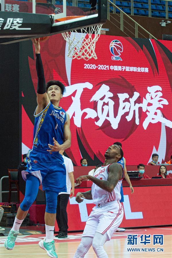 10月27日,苏州肯帝亚队球员黄荣奇(左)在比赛中上篮。 当日,在浙江诸暨举行的2020-2021赛季中国男子篮球职业联赛(CBA)第一阶段第五轮比赛中,苏州肯帝亚队以114比113战胜青岛国信海天队。 新华社发(江汉摄)