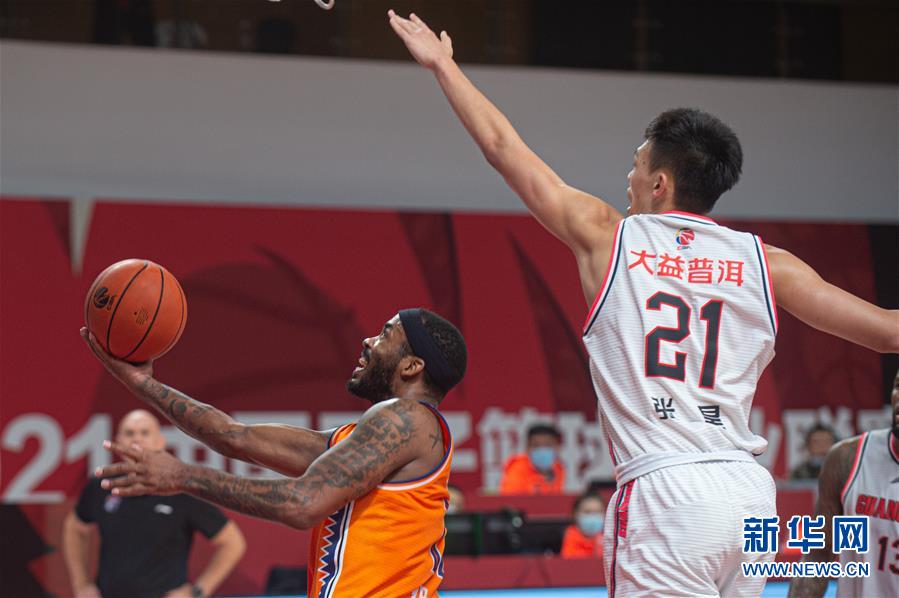 10月29日,上海久事队球员邓蒙(左)在广东东莞大益队球员张昊的防守下上篮。 当日,在浙江诸暨举行的2020-2021赛季中国男子篮球职业联赛(CBA)第一阶段第六轮比赛中,广东东莞大益队以119比105战胜上海久事队。 新华社发(江汉摄)