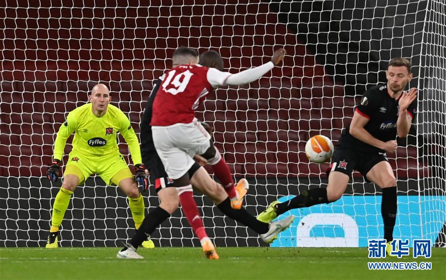 10月29日,阿森纳队球员佩佩(前)在比赛中射门得分。 当日,在2020-2021赛季欧罗巴联赛小组赛B组第二轮的一场比赛中,英超阿森纳队主场以3比0战胜爱尔兰超级联赛的敦达克队。 新华社/路透