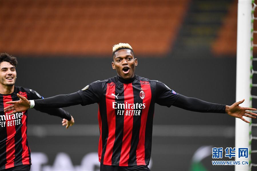 10月29日,AC米兰队球员莱奥(右)在进球后庆祝。 当日,在2020-2021赛季欧罗巴联赛小组赛H组第二轮的一场比赛中,意甲AC米兰主场以3比0战胜捷甲布拉格斯巴达队。 新华社发(阿尔贝托·林格利亚摄)