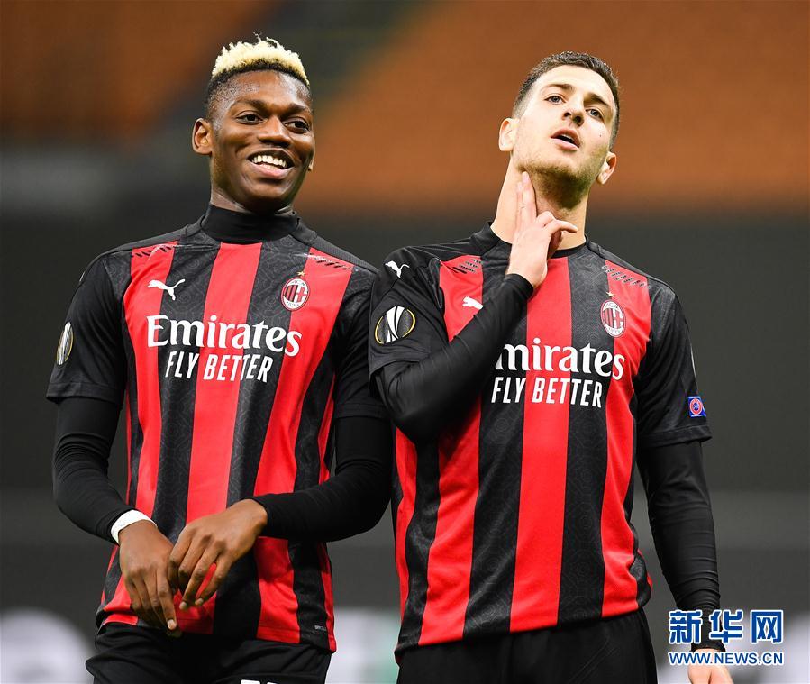 10月29日,AC米兰队球员达洛特(右)在进球后与队友莱奥庆祝。 当日,在2020-2021赛季欧罗巴联赛小组赛H组第二轮的一场比赛中,意甲AC米兰主场以3比0战胜捷甲布拉格斯巴达队。 新华社发(阿尔贝托·林格利亚摄)