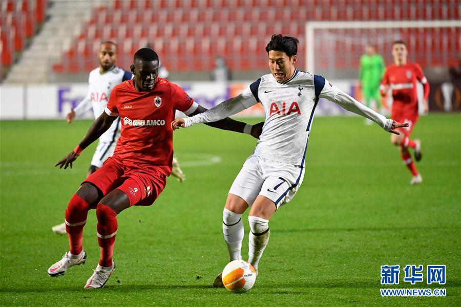 10月29日,热刺队球员孙兴民(前右)与安特卫普队球员塞克在比赛中拼抢。 当日,在2020-2021赛季欧罗巴联赛小组赛J组第二轮的一场比赛中,英超托特纳姆热刺队客场以0比1不敌比甲安特卫普队。 新华社/法新