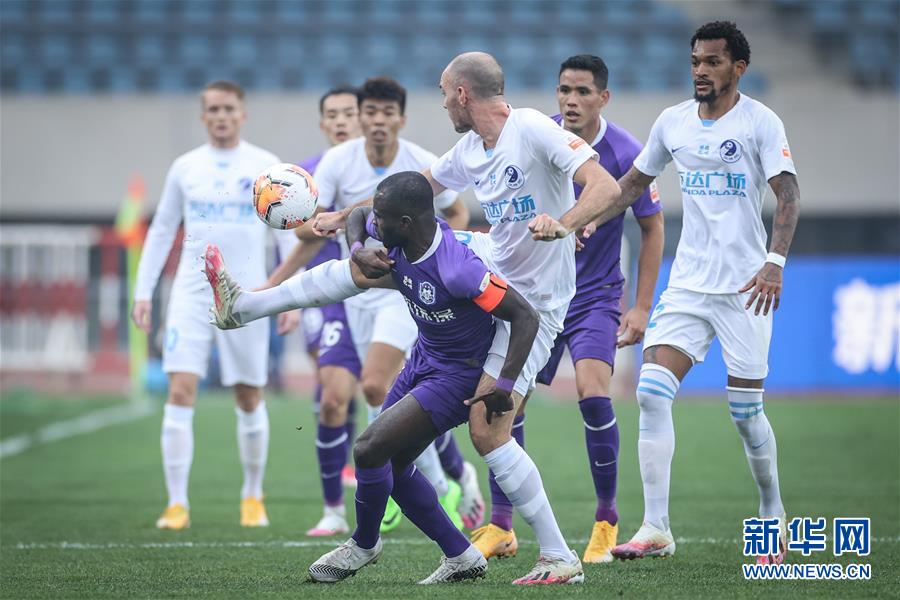 10月31日,大连人队球员丹尼尔森(前右)与天津泰达队球员阿奇姆彭(前左)拼抢。 当日,在2020赛季中国足球协会超级联赛(大连赛区)第18轮、9到12名排位赛中,大连人队以2比1战胜天津泰达队。最终,天津泰达队以两回合3比2的总比分晋级第九名争夺战。 新华社记者 潘昱龙 摄