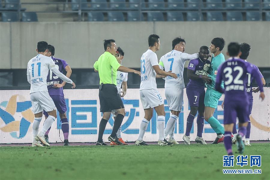 10月31日,双方球员在比赛中发生冲突。 当日,在2020赛季中国足球协会超级联赛(大连赛区)第18轮、9到12名排位赛中,大连人队以2比1战胜天津泰达队。最终,天津泰达队以两回合3比2的总比分晋级第九名争夺战。 新华社记者 潘昱龙 摄
