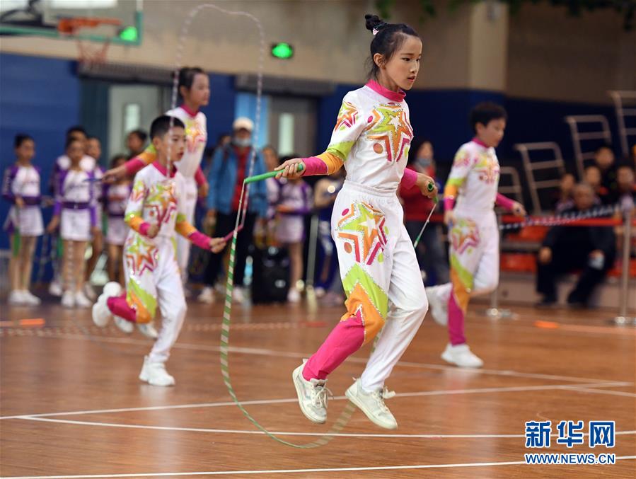10月31日,北京石油学院附属第二实验小学的选手在小学集体花样规定赛比赛中。 当日,2020年北京市中小学生民族传统体育节花样跳绳比赛在北京市第八中学京西附属小学举行。 据了解,本次花样跳绳比赛设有中学集体花样自编赛、中学集体花样规定赛、小学集体花样自编赛、小学集体花样规定赛四个比赛项目。 新华社记者 任超 摄
