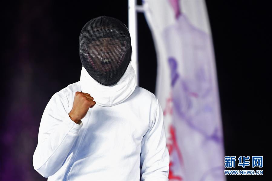 10月31日,王子杰庆祝胜利。 当日,2020中国击剑大师赛在南昌举行。在男子重剑决赛中,王子杰以15比11战胜石高峰,获得冠军。 新华社记者 万象 摄