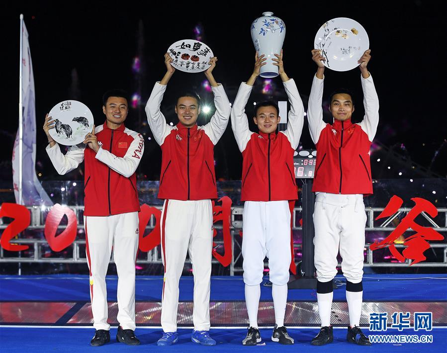10月31日,冠军王子杰(右二)、亚军石高峰(右一)和并列季军董超(左一)、兰明豪在男子重剑颁奖仪式上。 当日,2020中国击剑大师赛在南昌举行。 新华社记者 万象 摄