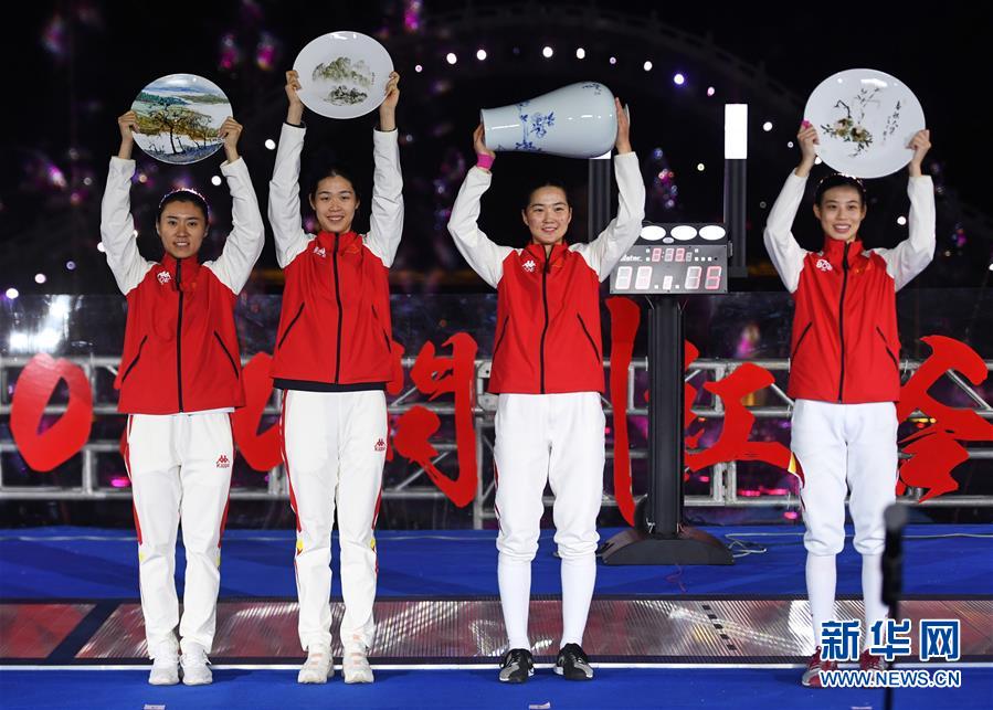 10月31日,冠军石玥(右二)、亚军吴培林(右一)和并列季军霍兴欣(左一)、陈情缘在女子花剑颁奖仪式上。 当日,2020中国击剑大师赛在南昌举行。在女子花剑决赛中,石玥以15比13战胜吴培林,获得冠军。 新华社记者 万象 摄