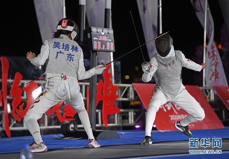 10月31日,石玥(右)与吴培林在决赛中。 当日,2020中国击剑大师赛在南昌举行。在女子花剑决赛中,石玥以15比13战胜吴培林,获得冠军。 新华社记者 万象 摄