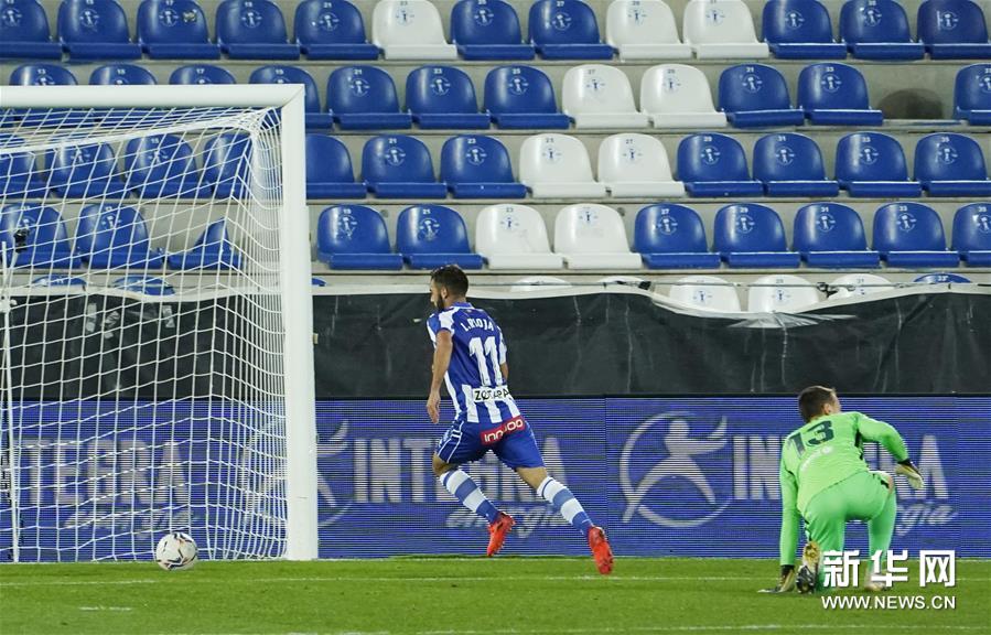 10月31日,阿拉维斯队球员里奥哈(左)在比赛中射门得分。 当日,在2020-2021赛季西班牙足球甲级联赛第八轮比赛中,巴塞罗那队客场以1比1战平阿拉维斯队。 新华社/路透